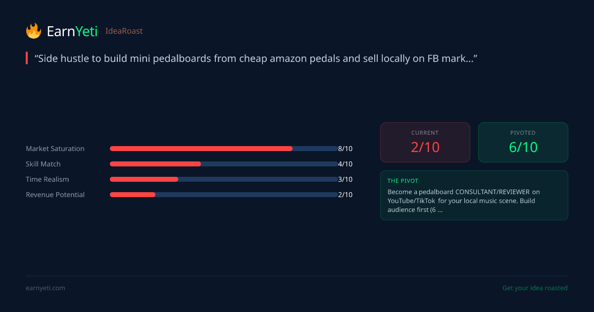 "You've discovered the business model of every broke guitarist in 2019 who watched one YouTube video—except now you're competing against people who actually know pedals AND have established audiences. You're basically dropshipping with extra steps and a soldering iron you don't own yet."