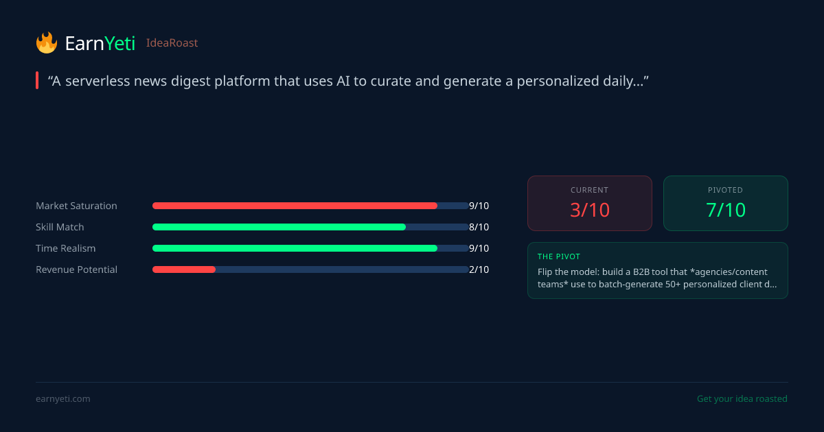 "You've built a technically competent newsletter generator in a market where Morning Brew, The Verge, and 47 AI newsletters already exist—you're essentially competing by being cheaper to run, which is a race to the bottom. The real question isn't 'can I build this?' but 'why would anyone subscribe to my digest instead of ChatGPT's built-in web search?'"
