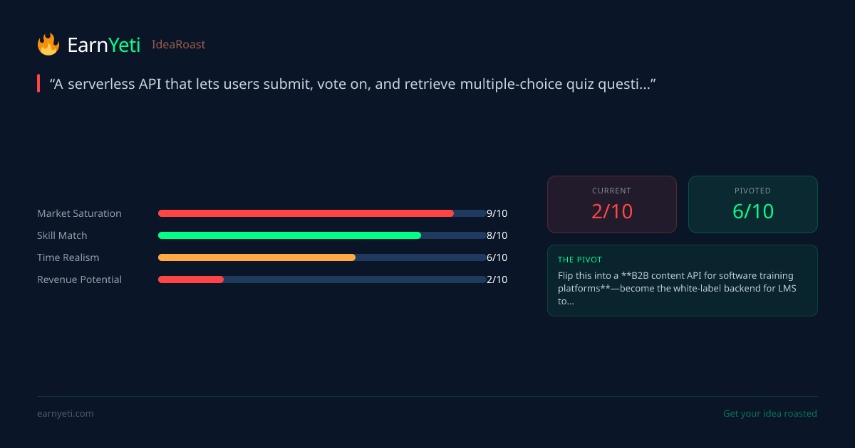 "You've built a technically competent quiz API that solves a problem nobody asked for—it's like creating the world's most elegant mousetrap when people switched to electric ones. Unless you've got enterprise customers lined up, this is a solution looking desperately for a problem, wrapped in AWS bills."