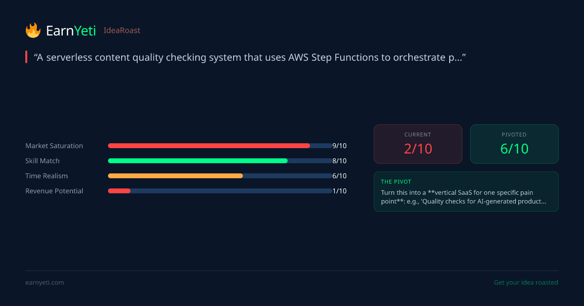 Turn this into a **vertical SaaS for one specific pain point**: e.g., 'Quality checks for AI-generated product descriptions' or 'Automated content QA for e-commerce teams.' Find 10 Shopify store owners struggling with product copy quality, charge them $99/mo, and use your Step Function POC as the tech foundation. That's a real business.