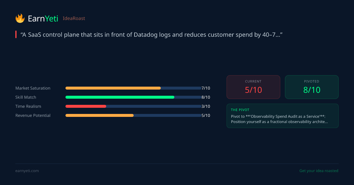 "You're building a product for a problem Datadog is actively solving in-house, betting that customers will adopt yet another vendor to save money on a tool they've already committed to—basically asking companies to replace a hammer with a slightly lighter hammer wrapped in bureaucracy. The margins are slim, the sales cycle is nuclear, and you'll spend 18 months proving ROI to procurement teams who'd rather just upgrade their contract."