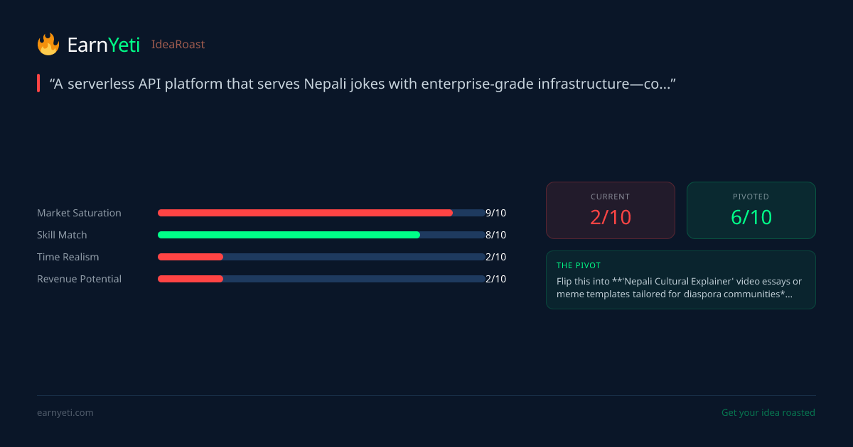 Flip this into **'Nepali Cultural Explainer' video essays or meme templates tailored for diaspora communities**—use your infra skills to build a creator toolkit instead. Sell templates, courses, or sponsorships to travel/language brands targeting the Nepali audience (underserved, high intent). Keep the jokes as a free funnel.