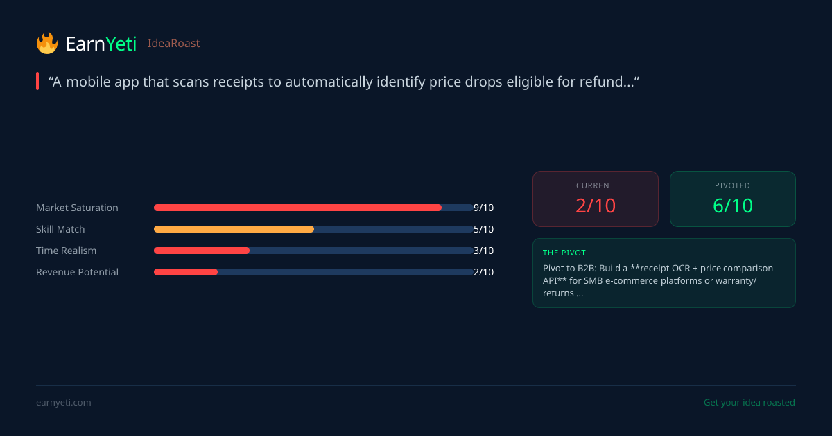Pivot to B2B: Build a **receipt OCR + price comparison API** for SMB e-commerce platforms or warranty/returns software companies. You own the tech layer, they own the users. Less sexy, way more defensible.