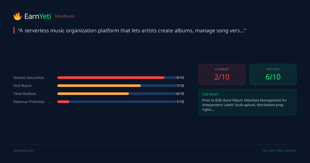 Pivot to B2B: Build 'Album Metadata Management for Independent Labels' (bulk upload, distribution prep, rights tracking). Target small indie labels, producers, and aggregators (DistroKid partners). Charge per release or monthly recurring. Your AWS backend becomes an asset, not a cost sink.