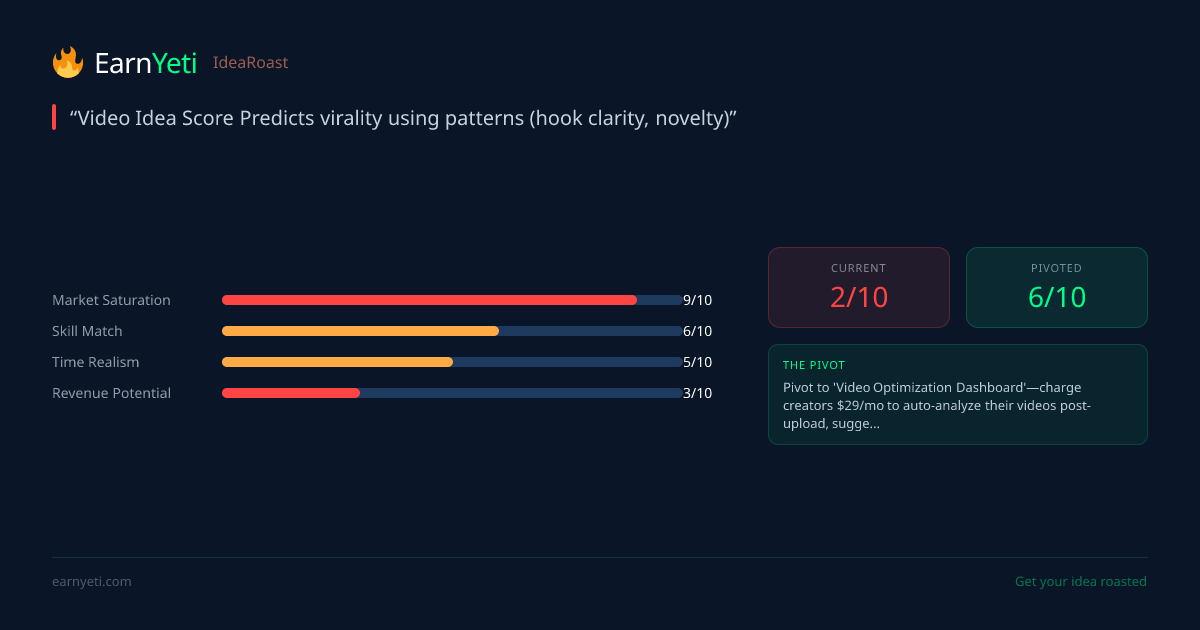 Pivot to 'Video Optimization Dashboard'—charge creators $29/mo to auto-analyze their videos post-upload, suggest specific re-edits (pacing, hook timing, B-roll), and A/B test thumbnails. Prediction is useless; optimization is *actionable*. You move from fortune teller to coach.