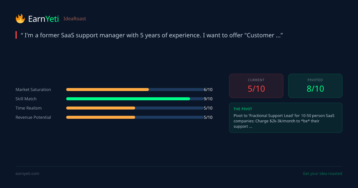 Pivot to 'Fractional Support Lead' for 10-50 person SaaS companies: Charge $2k-3k/month to *be* their support manager for 10-15 hours/week (triaged tickets, hire the first support person, build the playbook *while* handling live support, then train them to take over). This is high-urgency (founders are drowning), sticky (you become mission-critical), and scales to 3-4 clients easily on 20 hours/week. Position as 'support operations + hiring' not 'consulting.'
