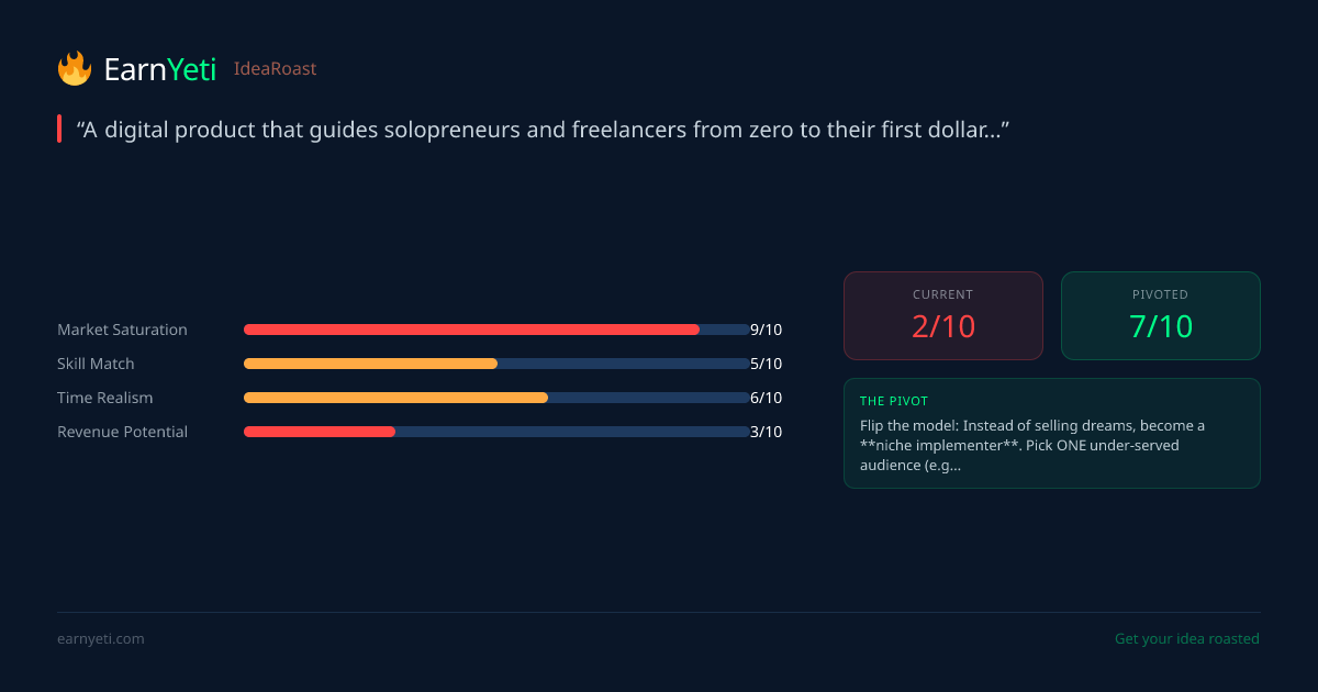 A digital product that guides solopreneurs and freelancers from zero to their first dollar by providing personalized income opportunities, ready-to-se...