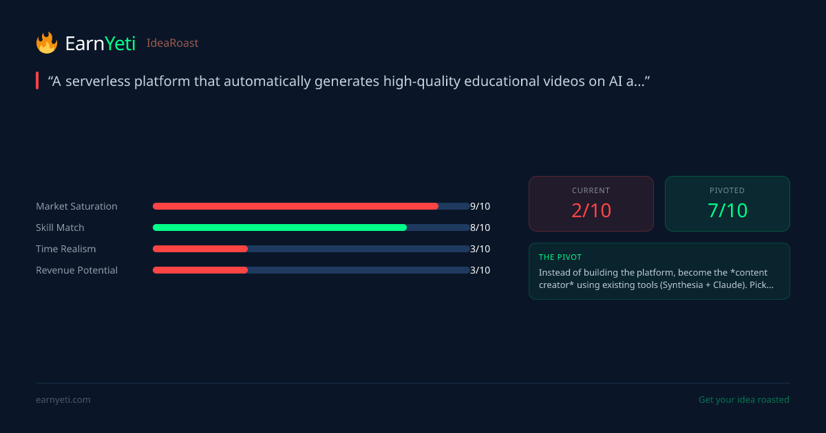 "You've built a beautiful, technically complex solution to a problem that doesn't exist yet — it's like engineering a Ferrari when the market is still asking for bicycles. AI video generation tools already exist (Synthesia, Pictory, Descript), and you're betting people will pay for *another* one that's specifically tailored to... AI tutorials? The irony is painful."